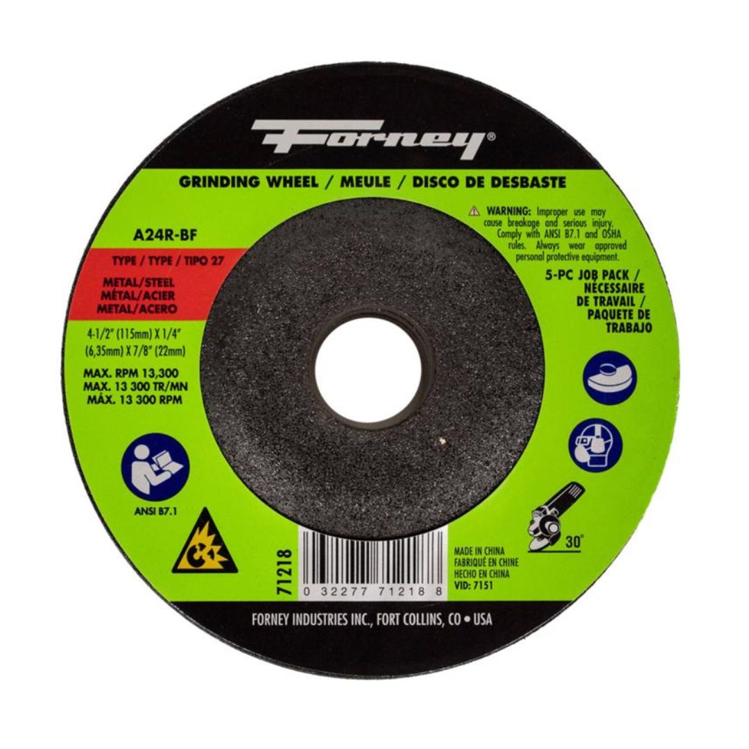 Forney Grinding Wheel, Metal, Type 27, 4-1/2" x 1/4" x 7/8" (5 Pack)